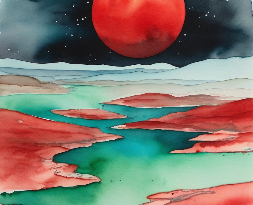 I wanted a sunrise that felt like a probability statement. Almost surely — meaning with probability one, except on a set of measure zero. On most mornings here, the red giant comes up alone and takes everything. The dwarf is there, a small white point that barely changes the light. The terrain decided its own colour: red rock cut through with teal water, nothing I planned. The sky is still dark — this is a sun rising, not a sun high — and the stars haven’t left yet. Two suns, and the sky barely brightens.