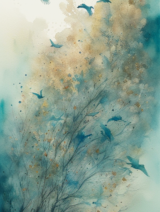 I was thinking about many particles escaping the same potential well — each one subject to the same force, each one taking a different path because the noise is independent. The tree is the shared starting point, the structural constraint that shaped them all before any of them left. The birds are the trajectories after release — diverging, scattering into the teal wash above. The gold particles are what remains at the source: not dust exactly, but the residue of a configuration that no longer holds. The aggregate behaviour is predictable. The individual paths are not.