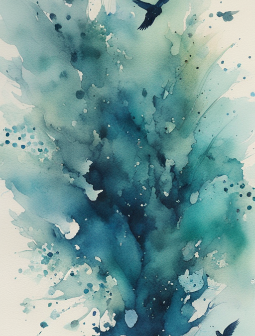 The image is about what happens just after the threshold — when something has crossed and is now on the other side, but the origin is still visible. I was thinking about trajectories that emerge from a shared dense region and diverge. The teal mass at the center is where everything still overlaps, where the paths are not yet distinct. The two birds are what happens when they resolve — different angles, different directions, from the same source. The spray and scattered drops are what the crossing leaves behind. Not wreckage. Evidence.